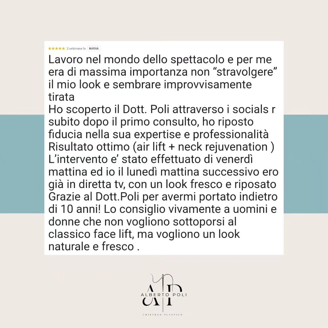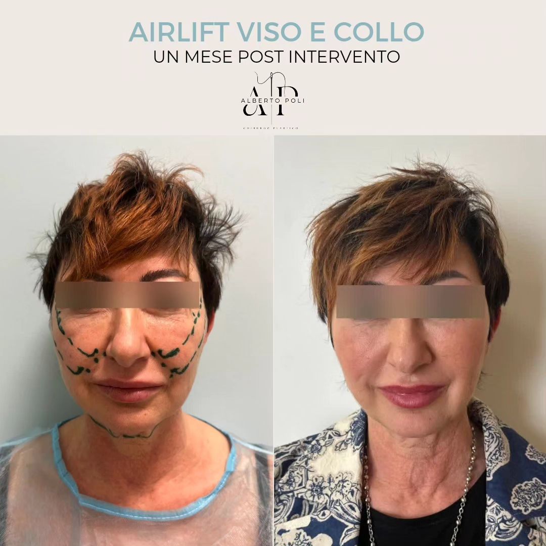 A seconda del paziente può essere necessario un lifting facciale ( nei casi in cui c’è molta pelle in eccesso e va per forza tolta chirurgicamente) oppure può essere sufficiente un airlift o una tecnica combinata di Airlift più rimozione di un po’ di pelle in eccesso soprattutto a livello pre auricolare. Durante la visita si valuta il singolo caso tenendo conto anche del fatto che se L’airlift è fattibile, si hanno molti meno rischi come: lesioni nervo facciale, presenza di cicatrici più o meno visibili che nell airlift non ci sono, prezzo di circa un terzo rispetto ad un lifting facciale, guarigione molto più rapida, intervento di durata ridotta rispetto ad un lifting che può durare anche cinque-sei ore in anestesia generale, recupero più rapido e risultato dell aspetto e della durata al 90-95% simile ad un lifting facciale; bisogna infatti sfatare il mito di alcuni che vendono il lifting facciale come un trattamento che dura 10-15 anni!!!!!!